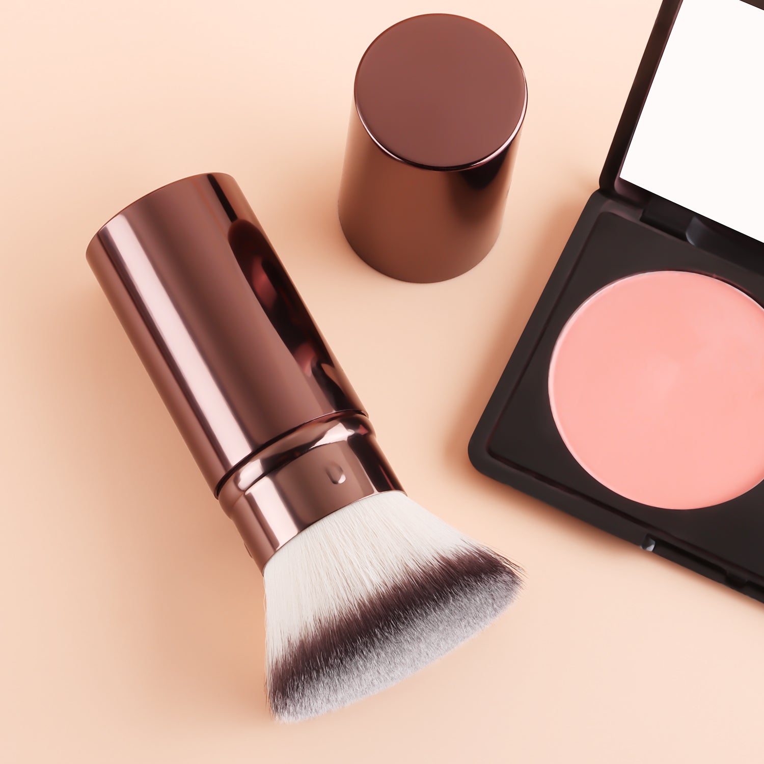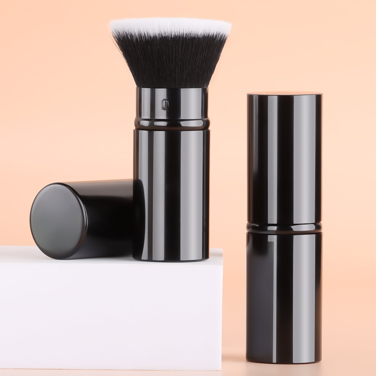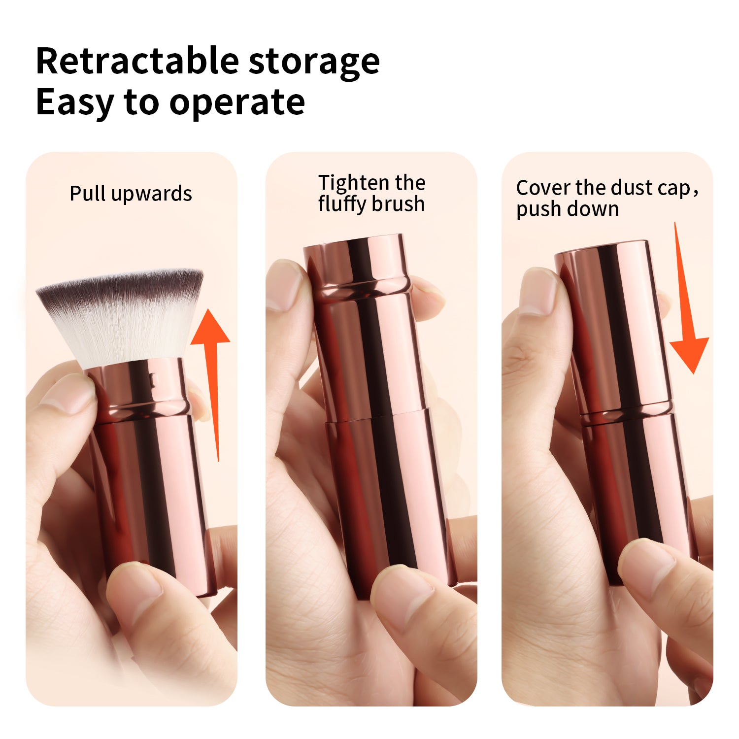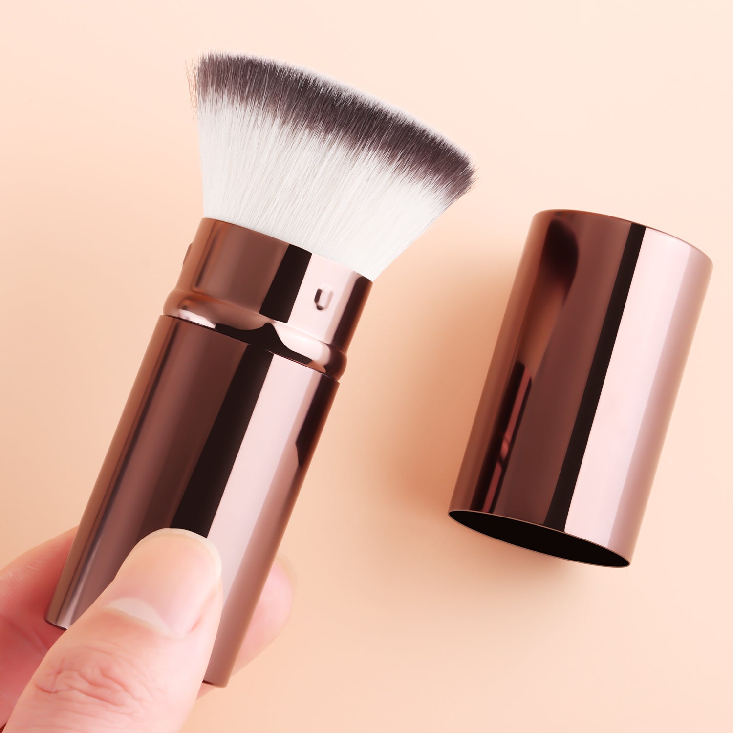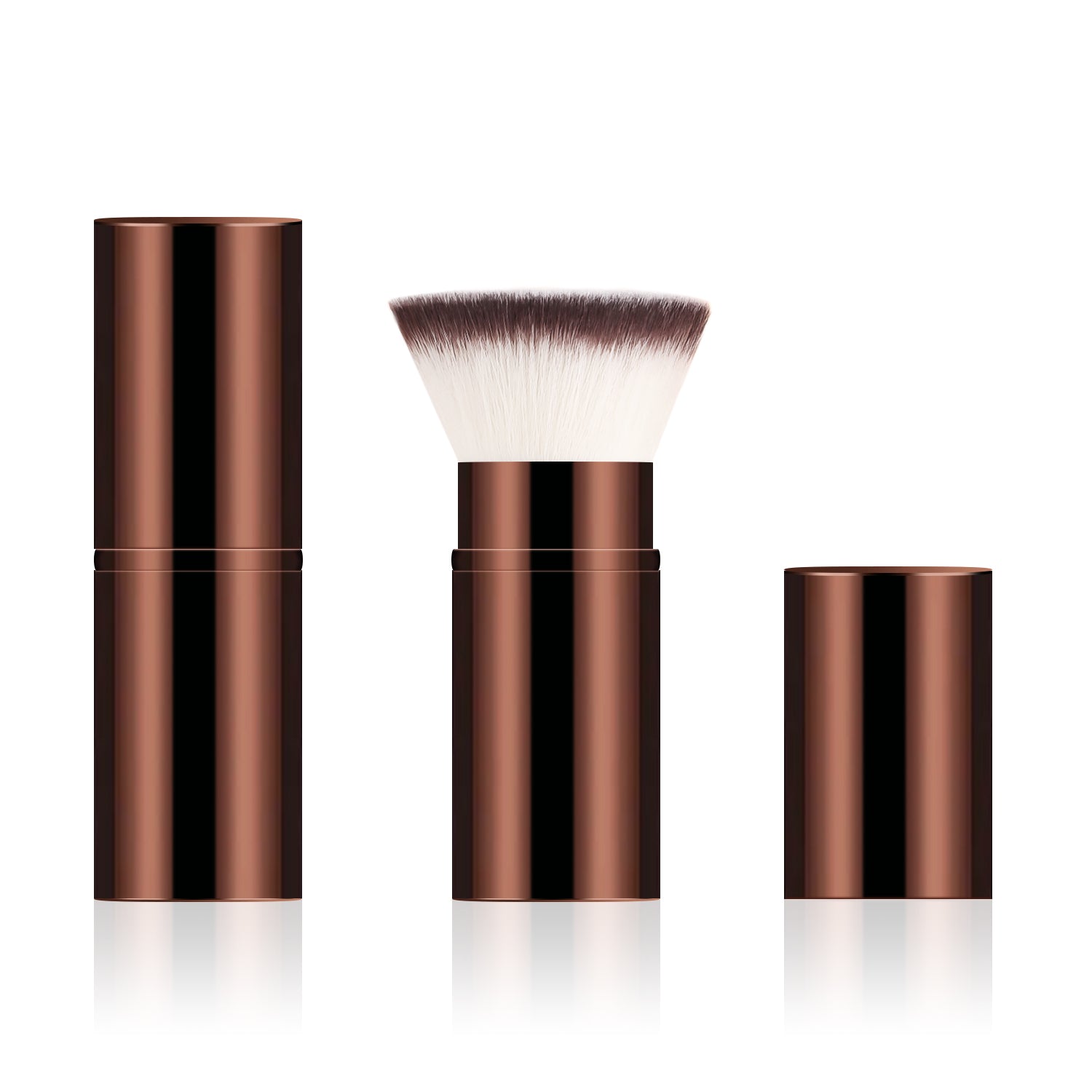 After dipping the brush into the product, gently shake off any excess powder. Apply makeup using a pressing and rolling technique (press and roll the foundation brush vertically, and blend the eyeshadow brush in a spiral motion). The aluminum-handled retractable brush uses a 45° angle to precisely contour the face, while the wooden-handled brush features a 32° anti-shake design for precise application.