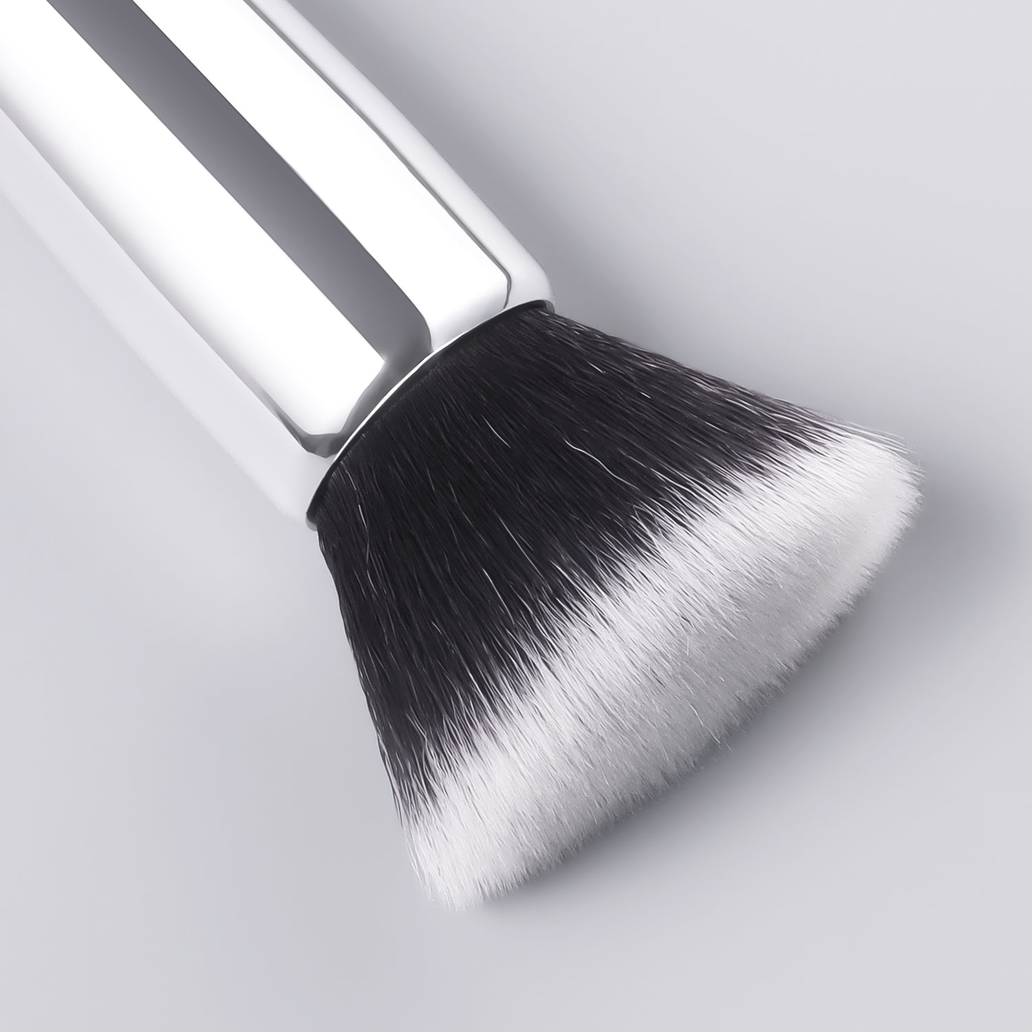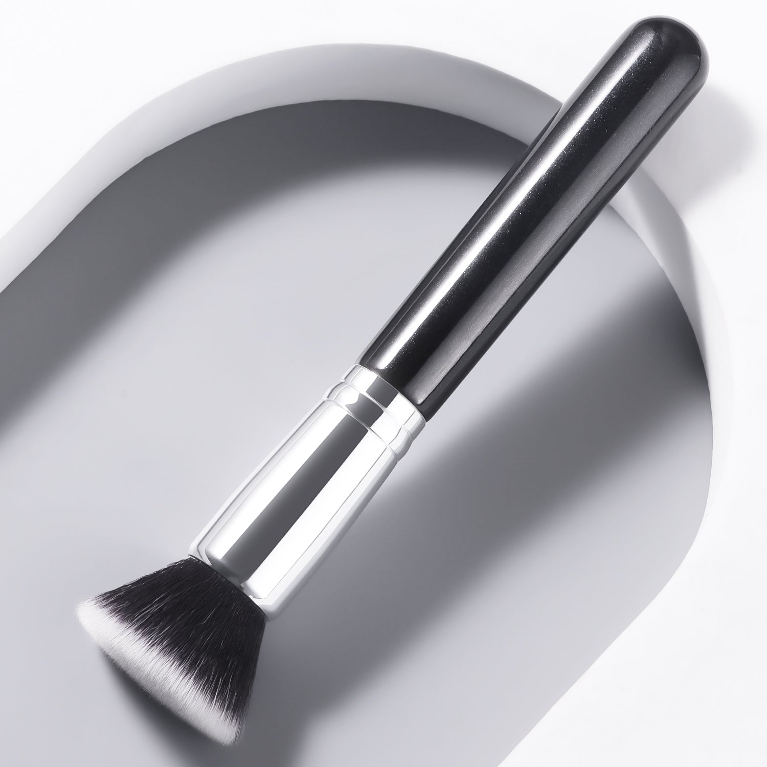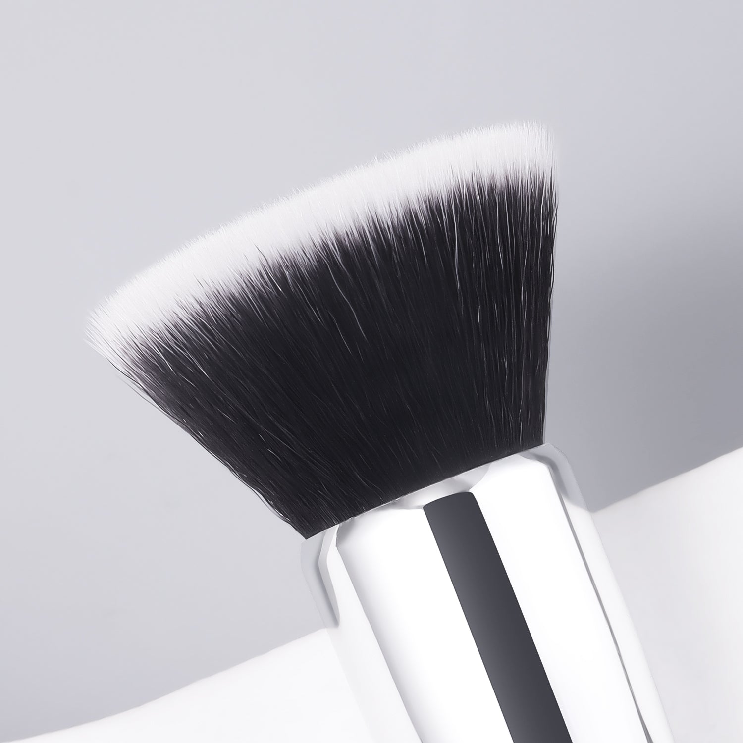 Streak-free foundation + sculpted contours in 60 seconds. The flat edge buffs product seamlessly—no more patchiness.