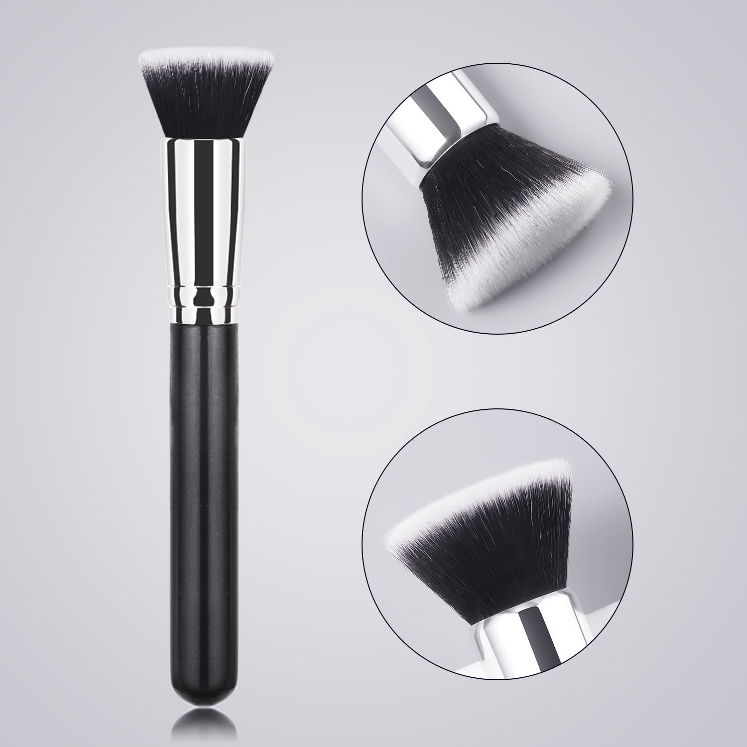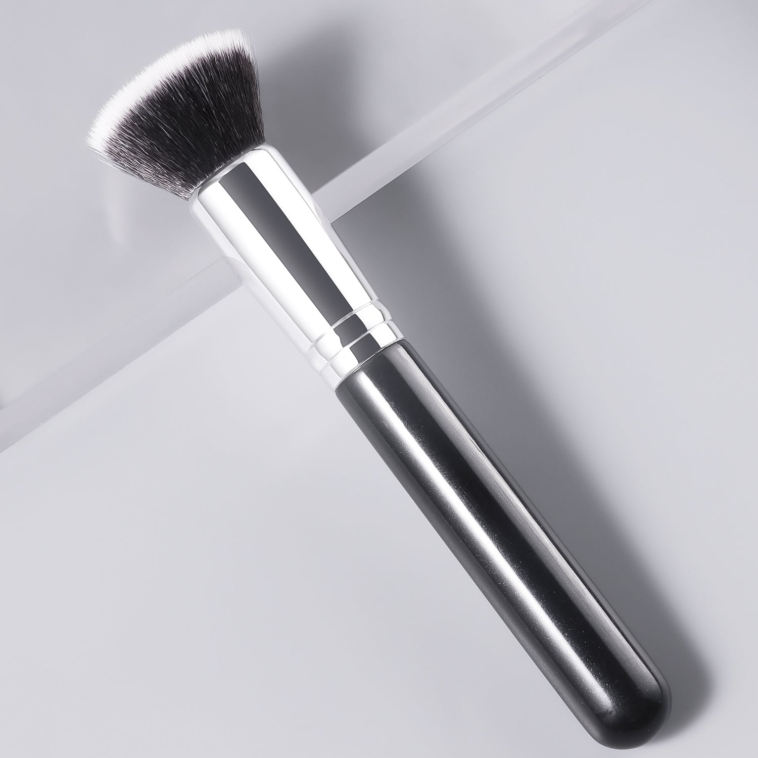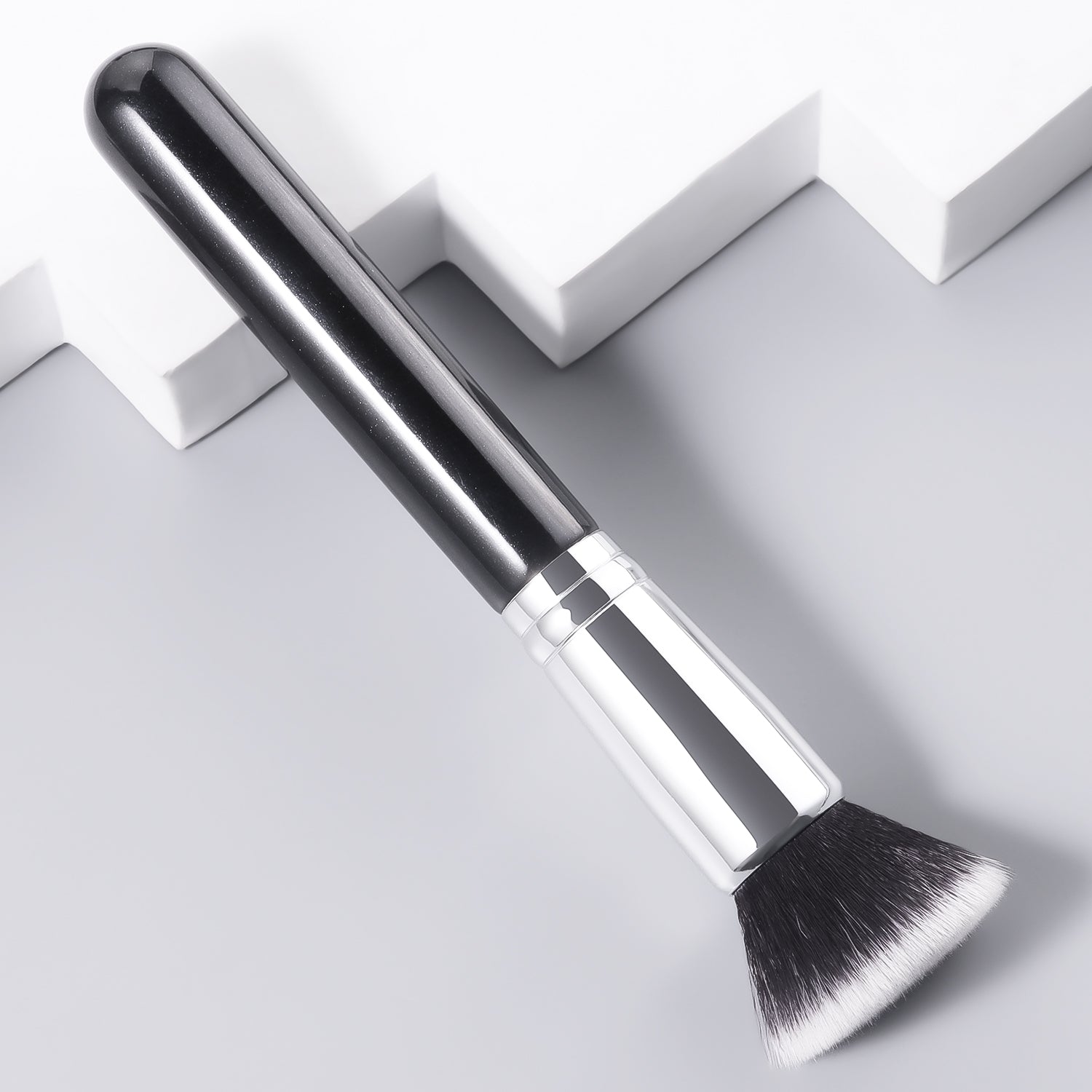 Streak-free foundation + sculpted contours in 60 seconds. The flat edge buffs product seamlessly—no more patchiness.