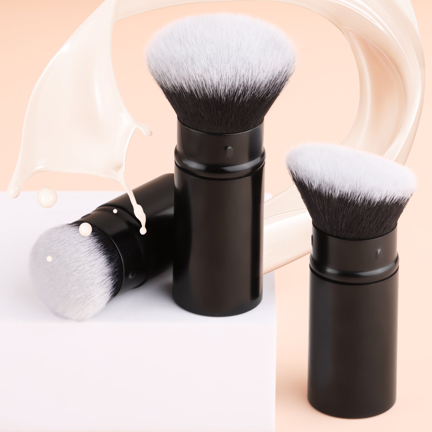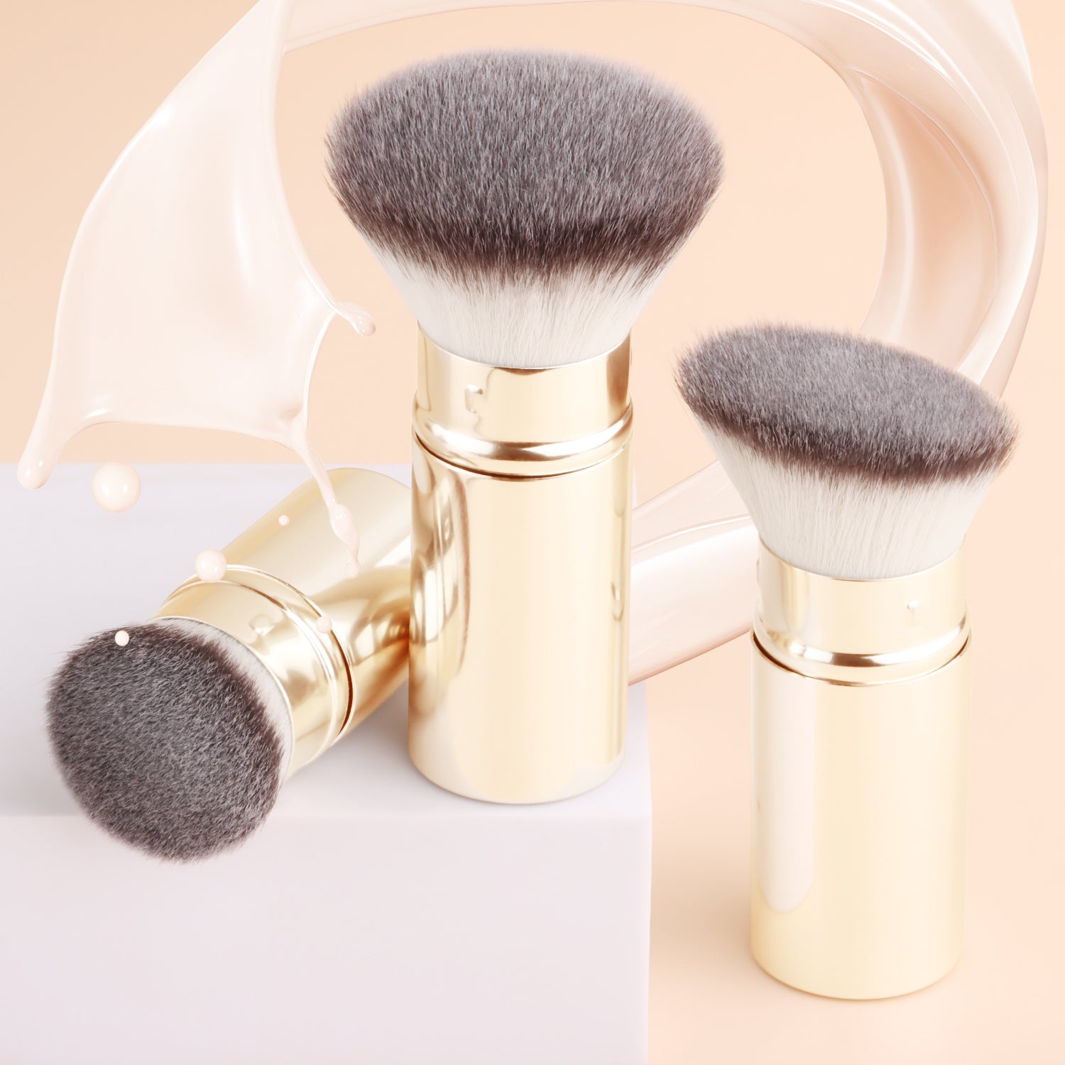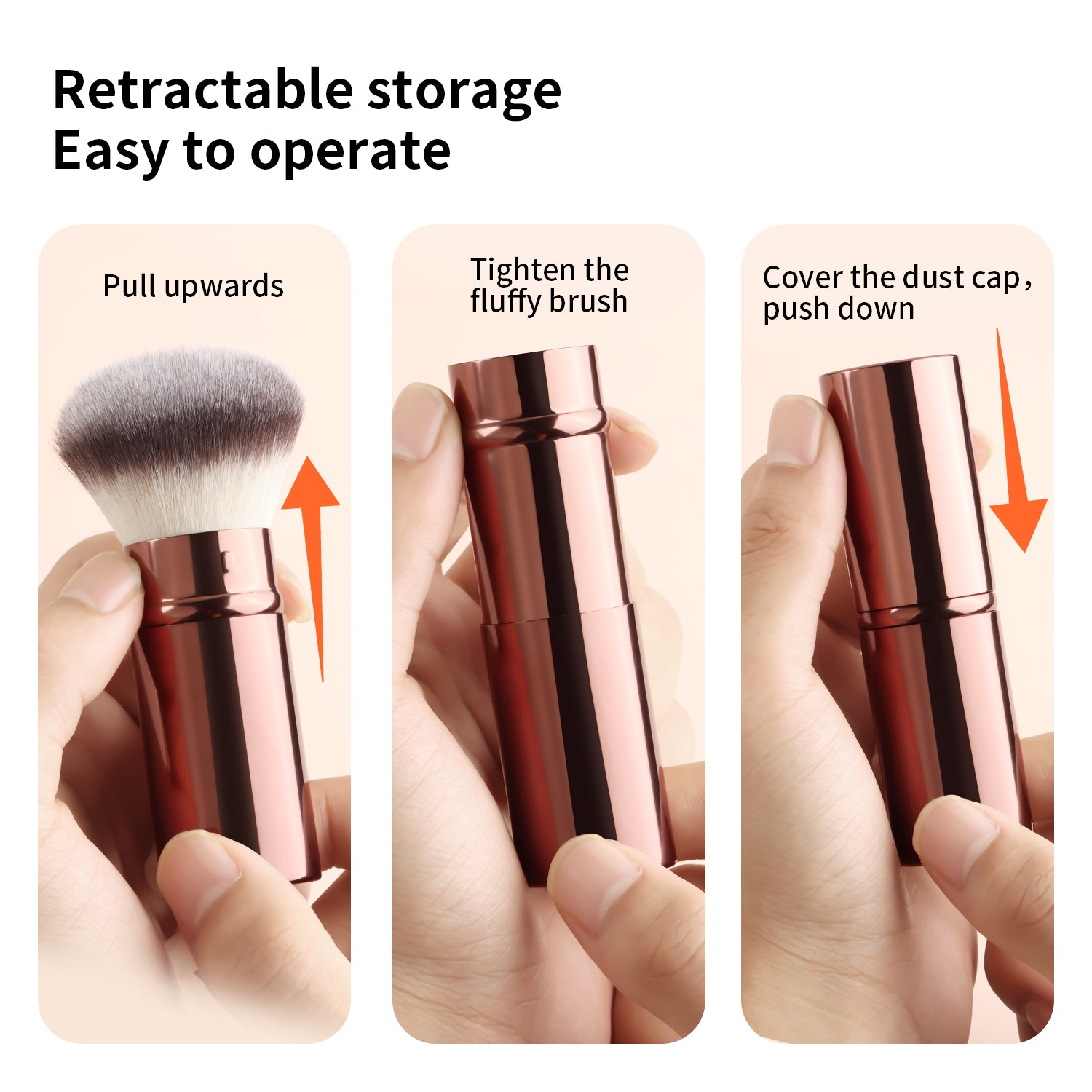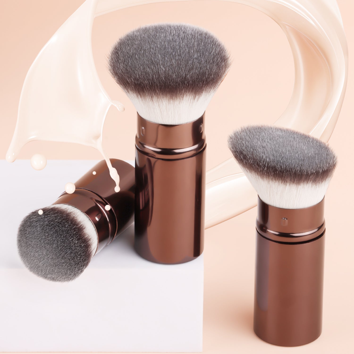 After dipping the brush into the product, gently shake off any excess powder. Apply makeup using a pressing and rolling technique (press and roll the foundation brush vertically, and blend the eyeshadow brush in a spiral motion). The aluminum-handled retractable brush uses a 45° angle to precisely contour the face, while the wooden-handled brush features a 32° anti-shake design for precise application.