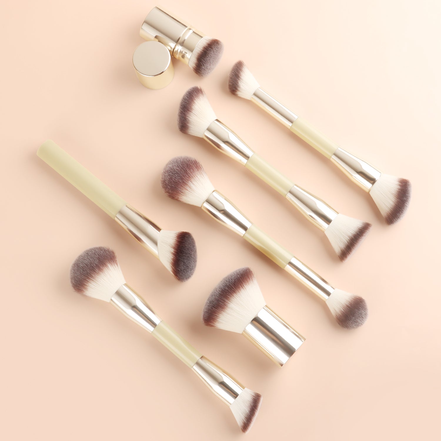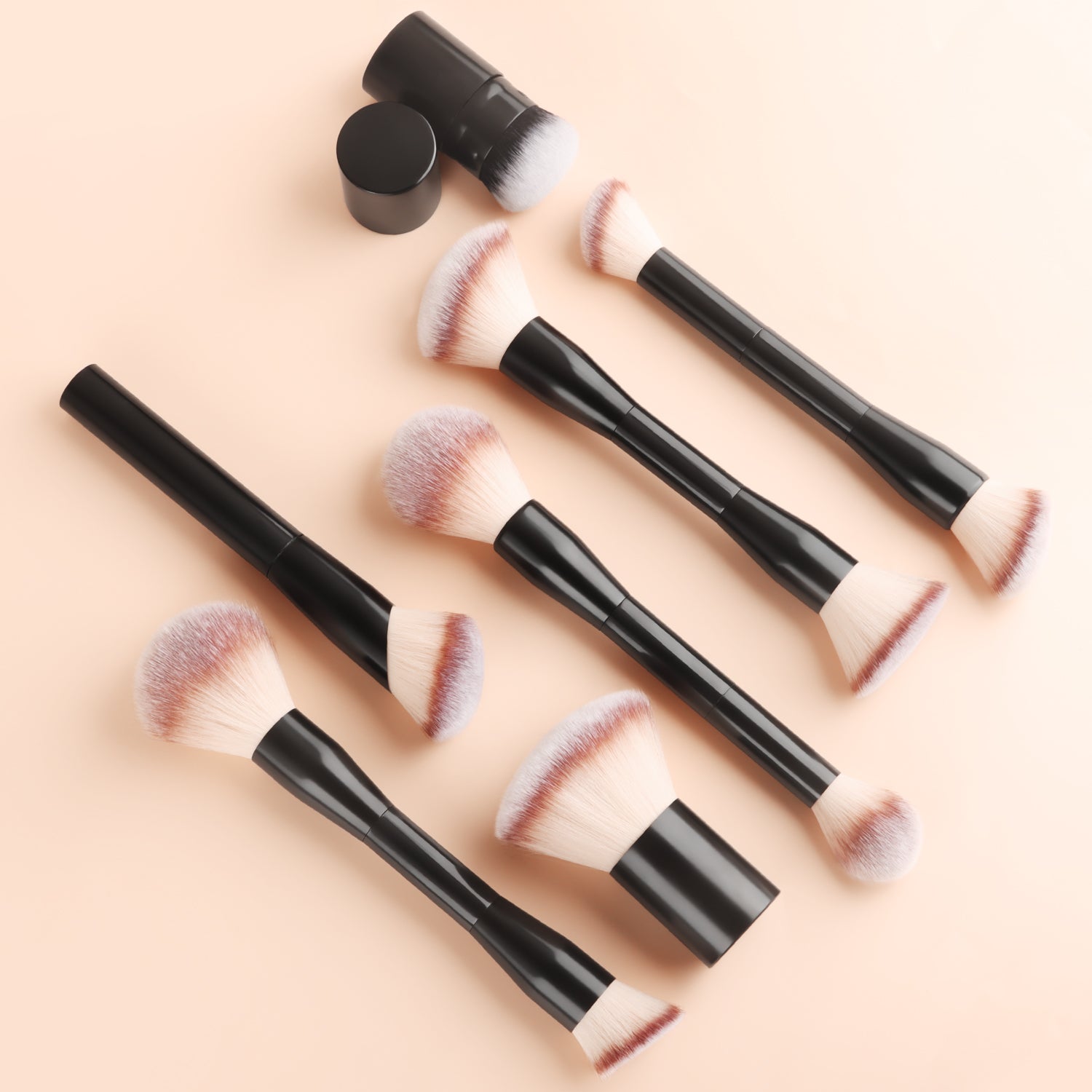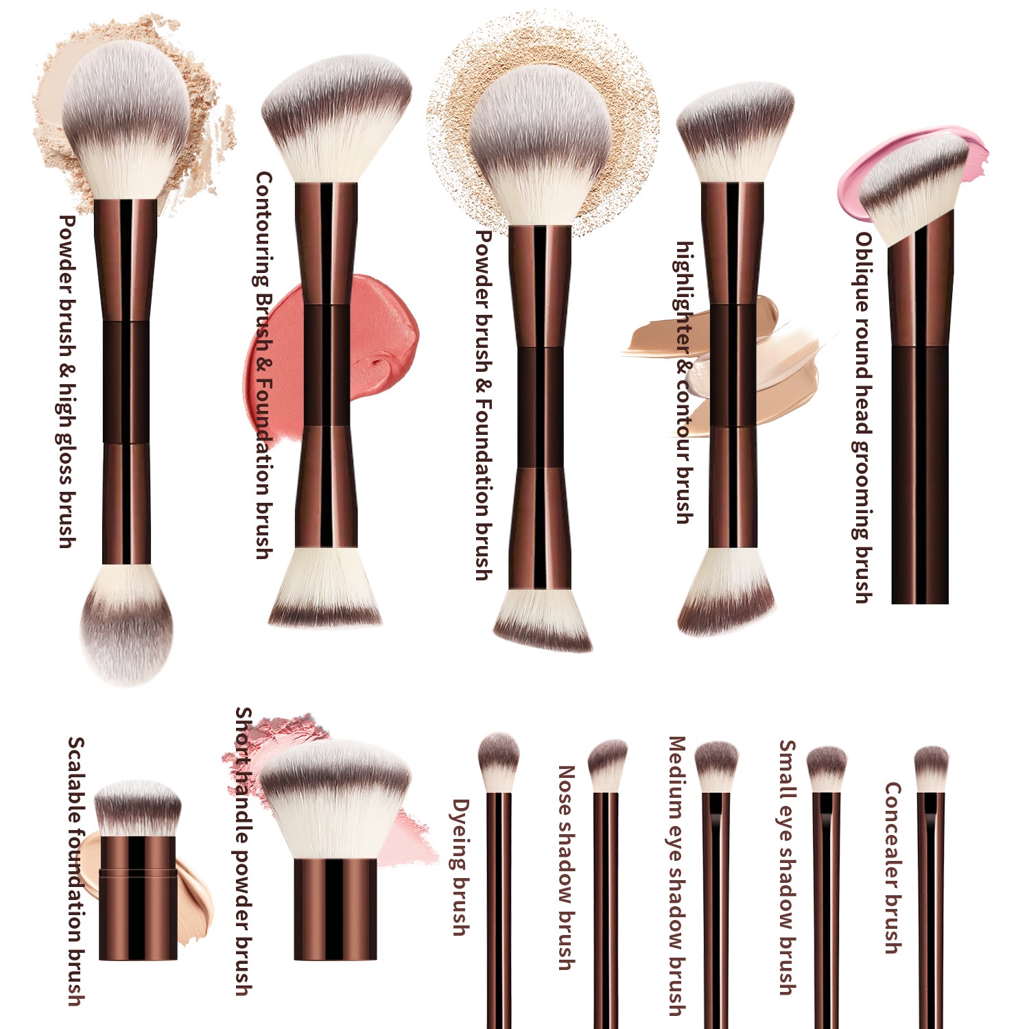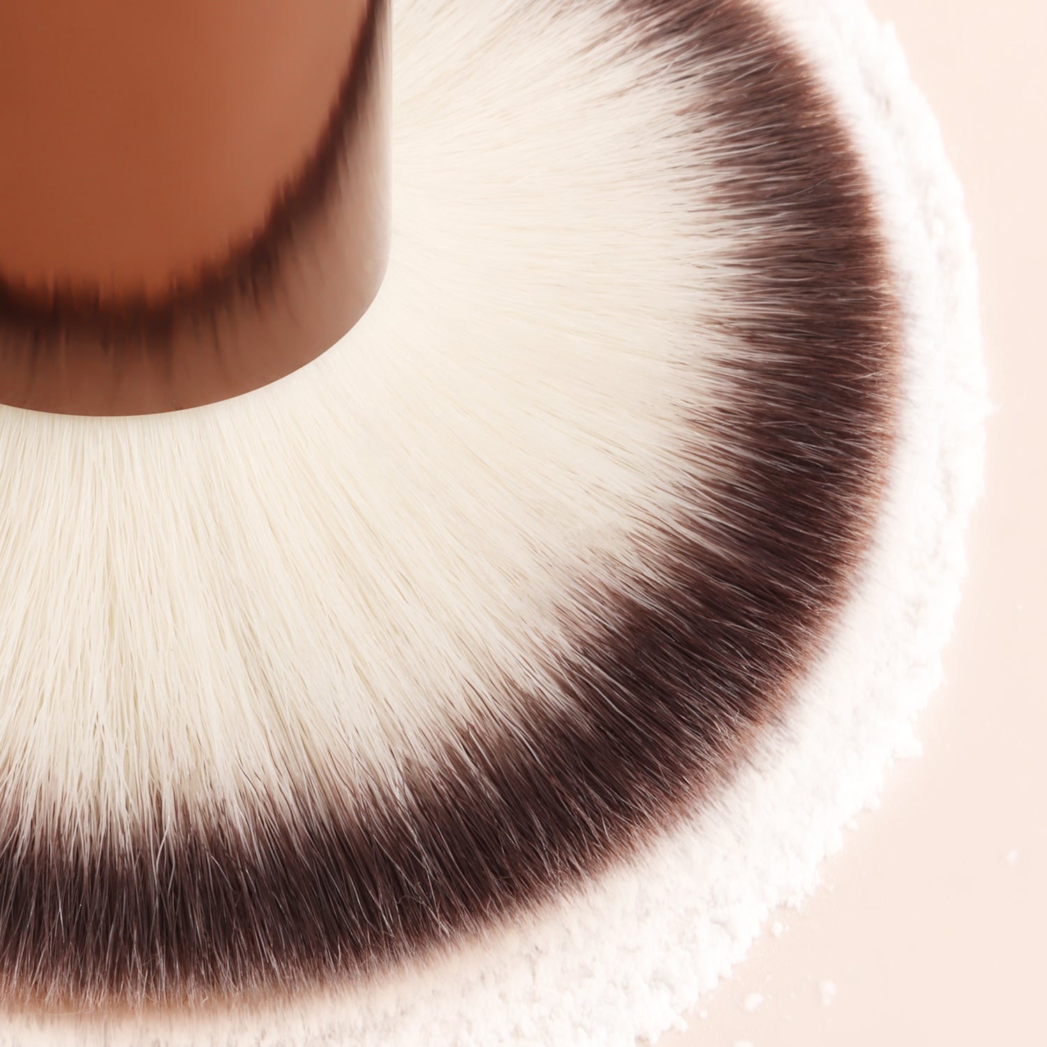 After dipping the brush into the product, gently shake off any excess powder. Apply makeup using a pressing and rolling technique (press and roll the foundation brush vertically, and blend the eyeshadow brush in a spiral motion). The aluminum-handled retractable brush uses a 45° angle to precisely contour the face, while the wooden-handled brush features a 32° anti-shake design for precise application.