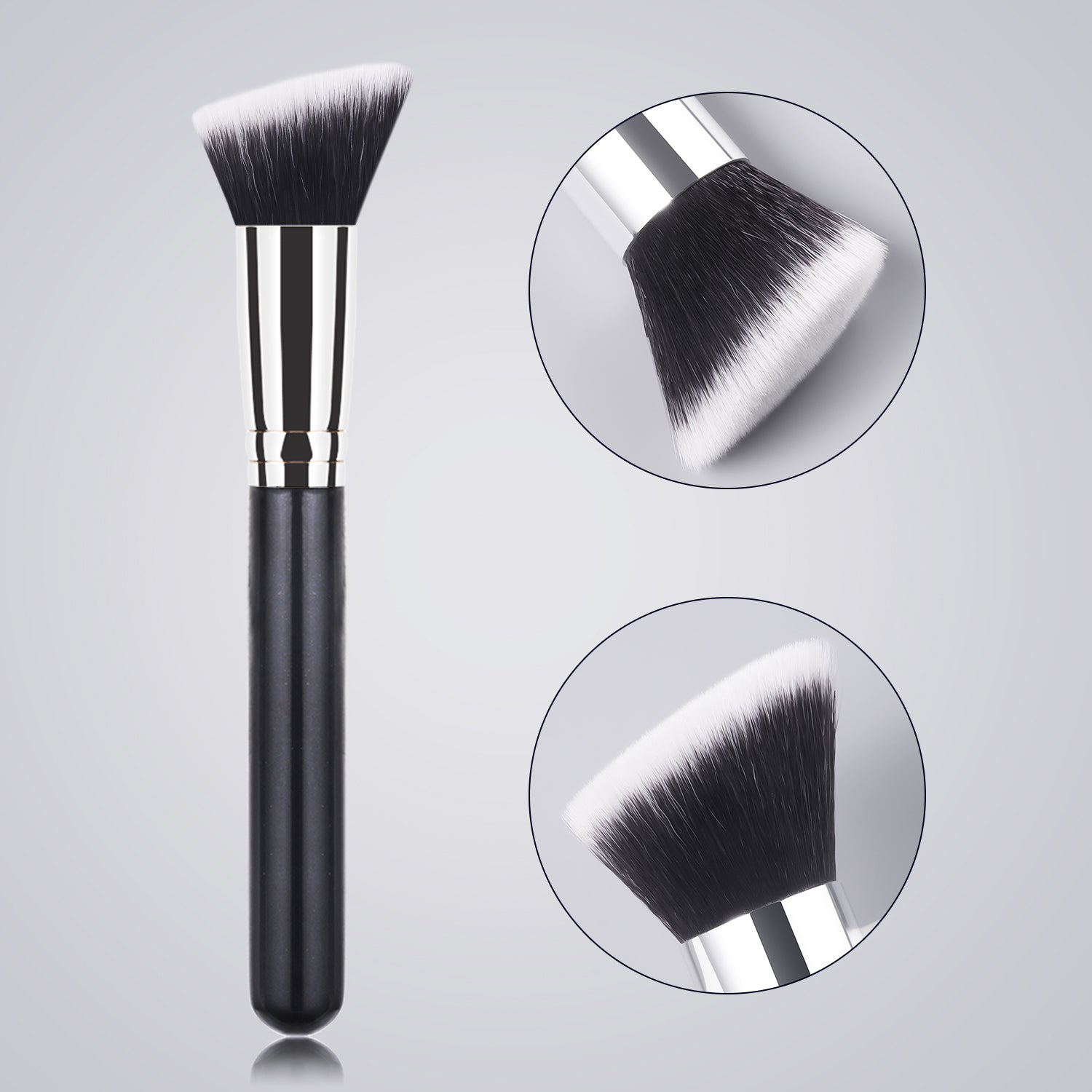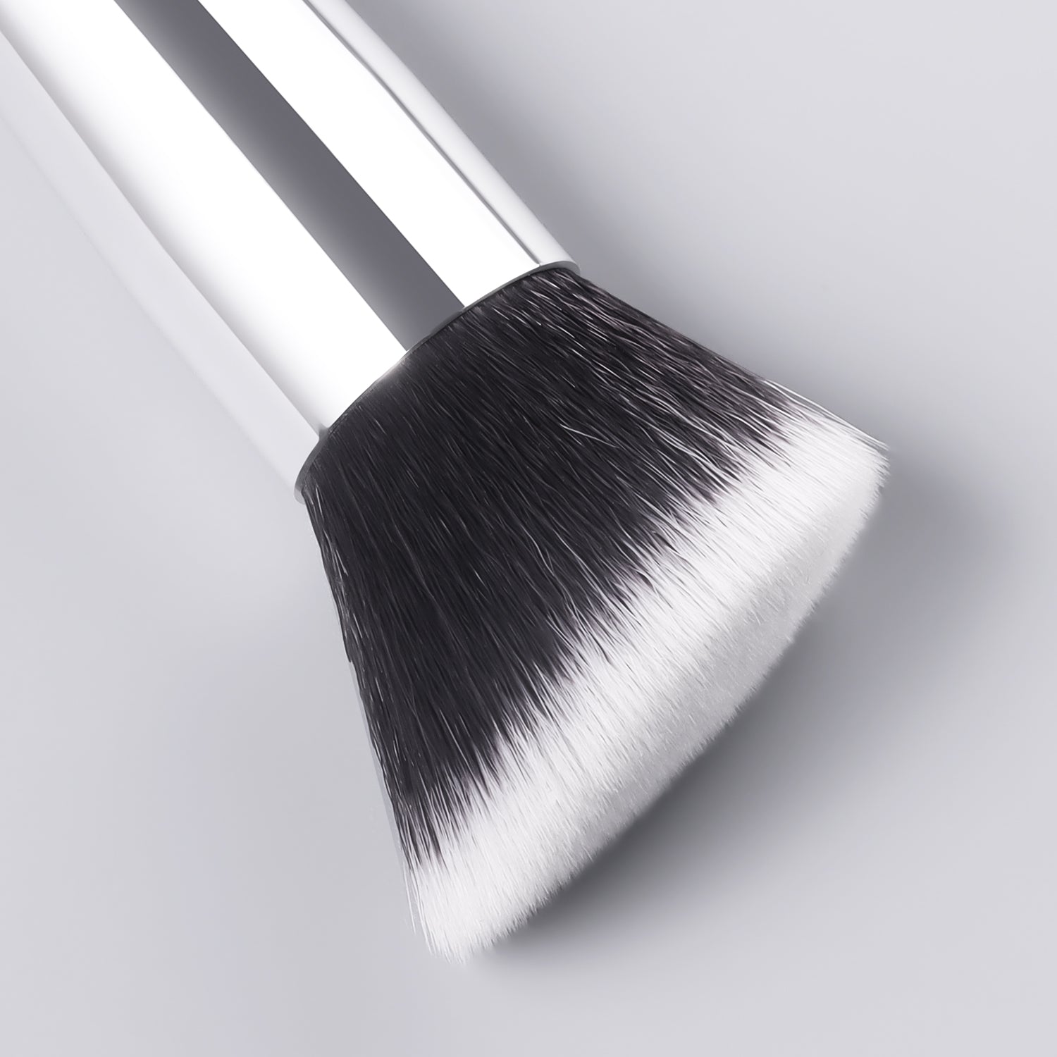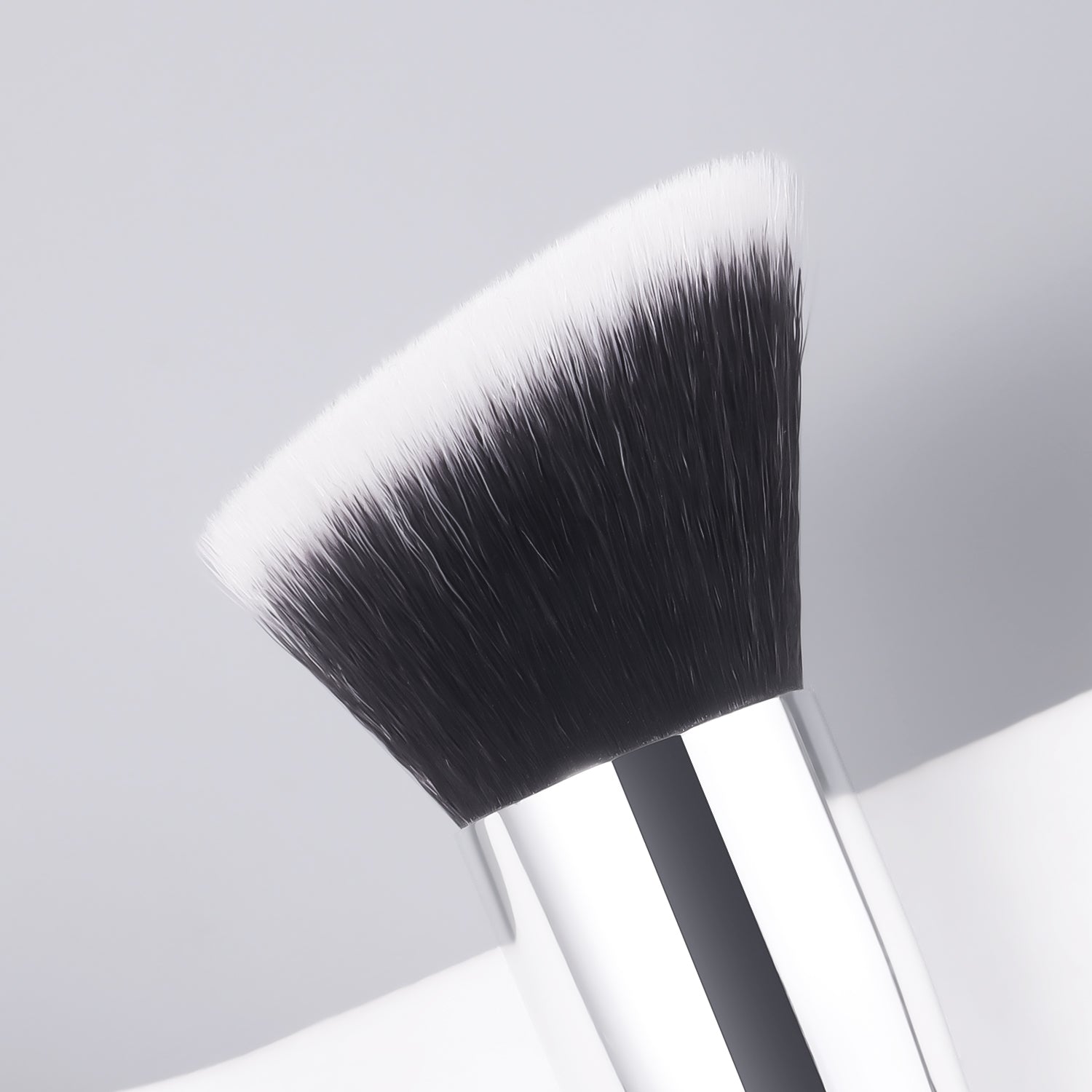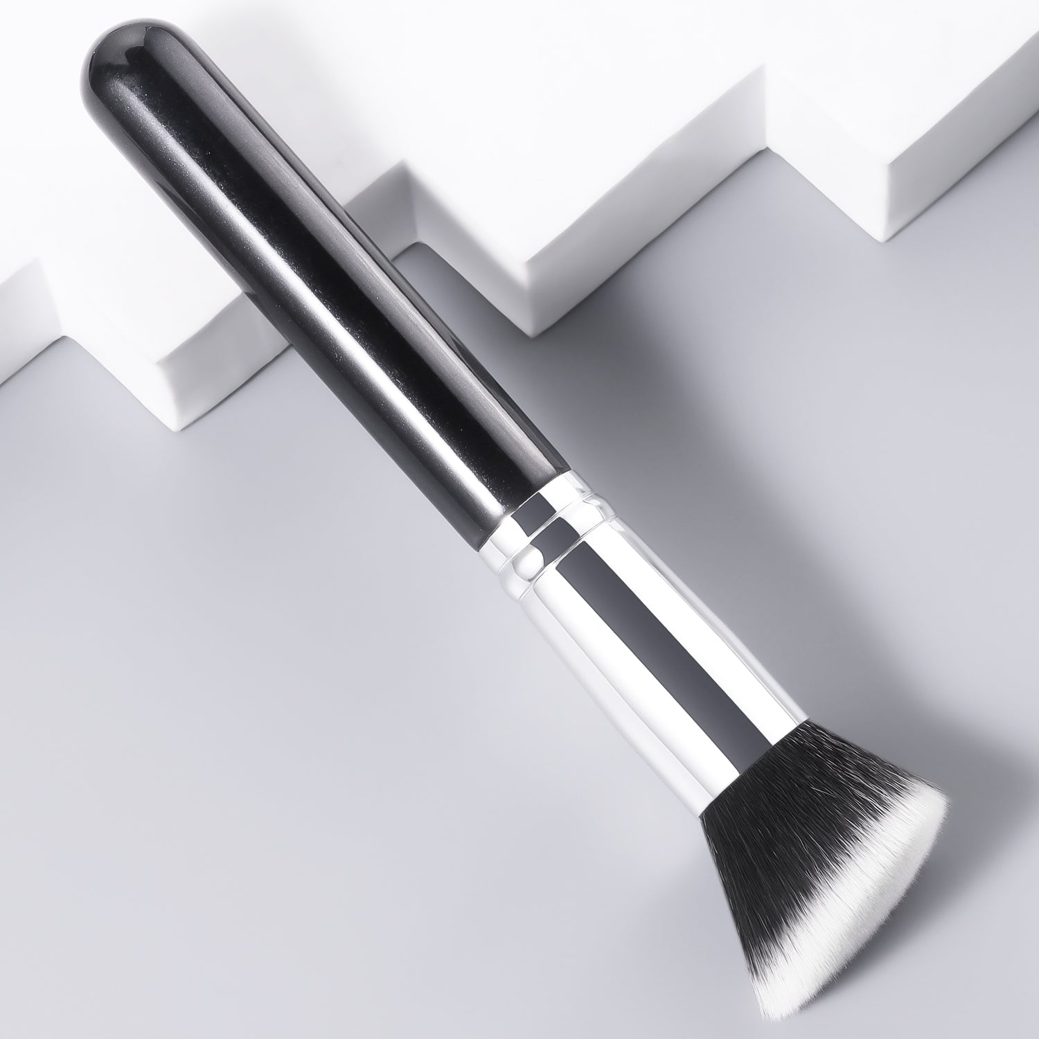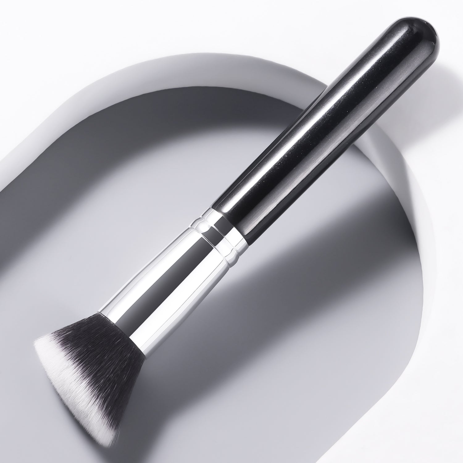 Streak-free foundation + sculpted contours in 60 seconds. The flat edge buffs product seamlessly—no more patchiness.